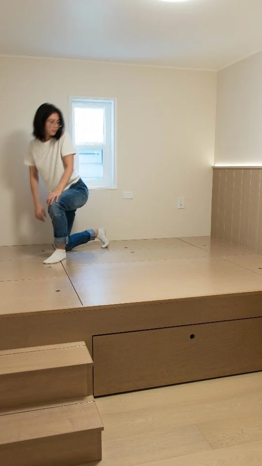 Calming hues paired with the playful grain of birch wood creates a grounding environment for the people using this space. A guest bedroom with plenty of functional storage options where a futon can get rolled up, luggage tucked away, and small belongings dropped off on the table top.