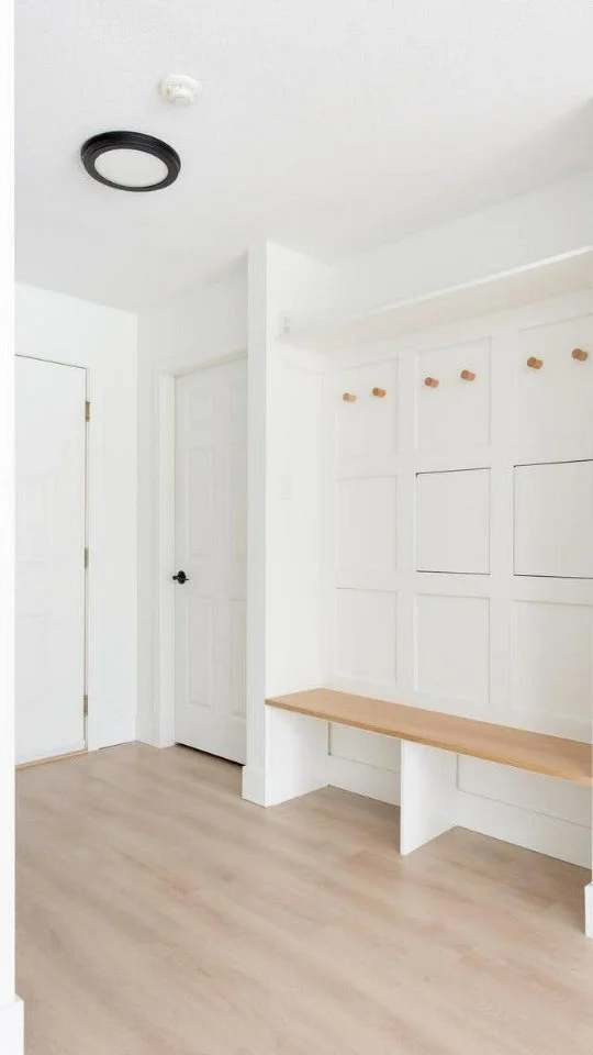 In this White Rock apartment, the entryway was built with two closets and a tight entryway. Aware of the large amount of storage space throughout the unit, one of the two closets was exchanged for an appealing seating area, accommodating for quick grab items such as jackets and bags, and with room for storage baskets or shoes above and below.
